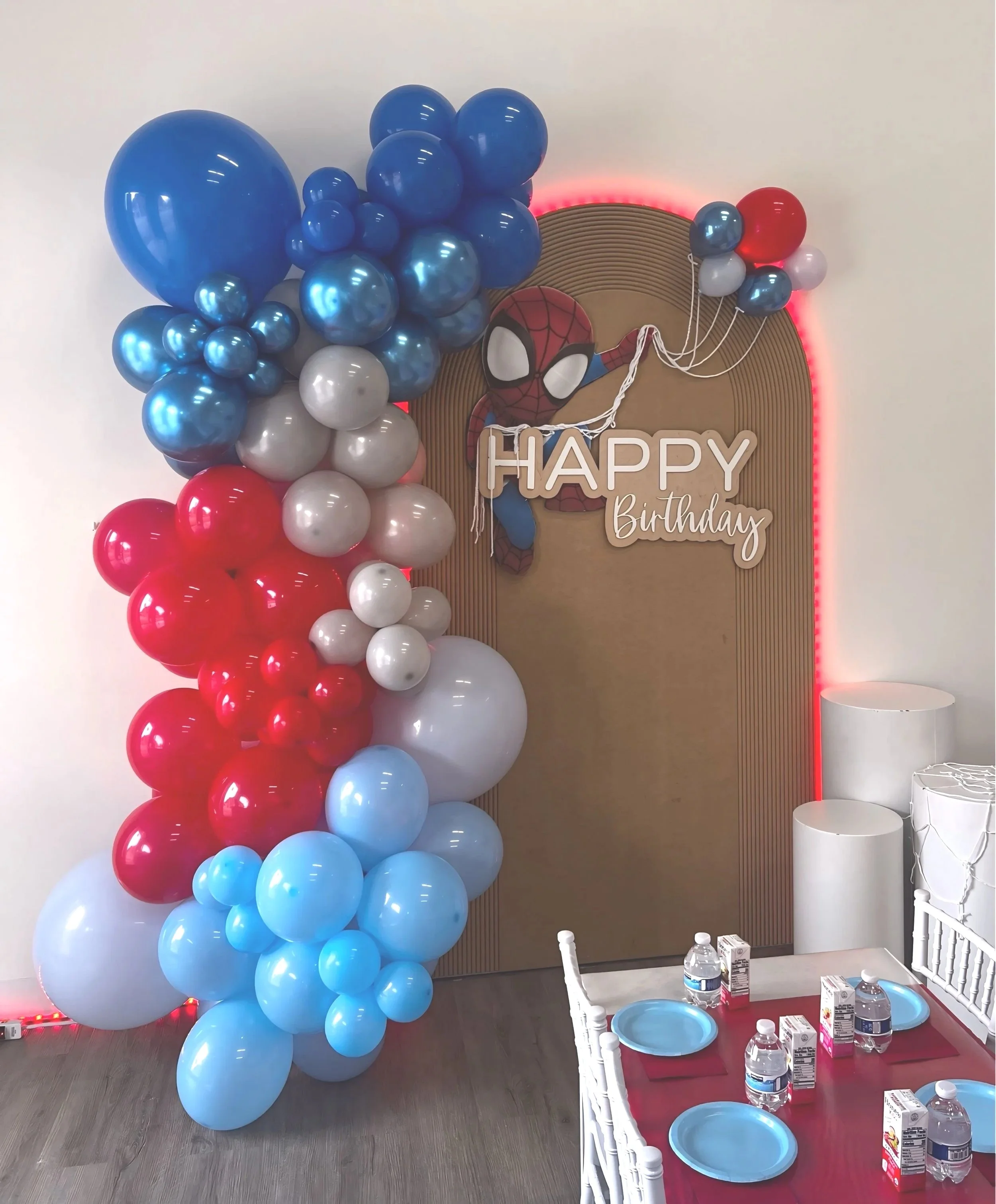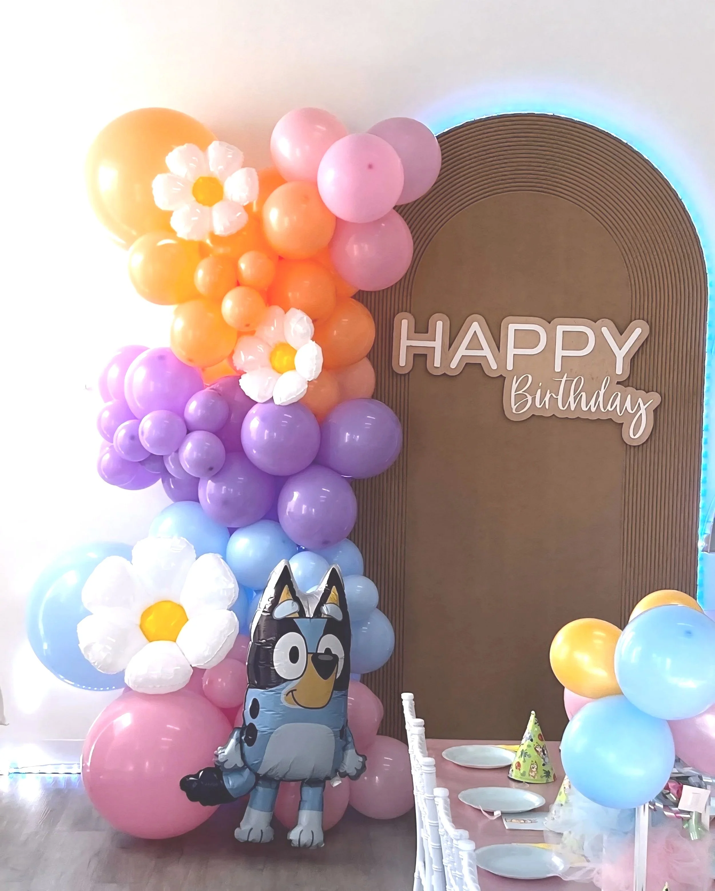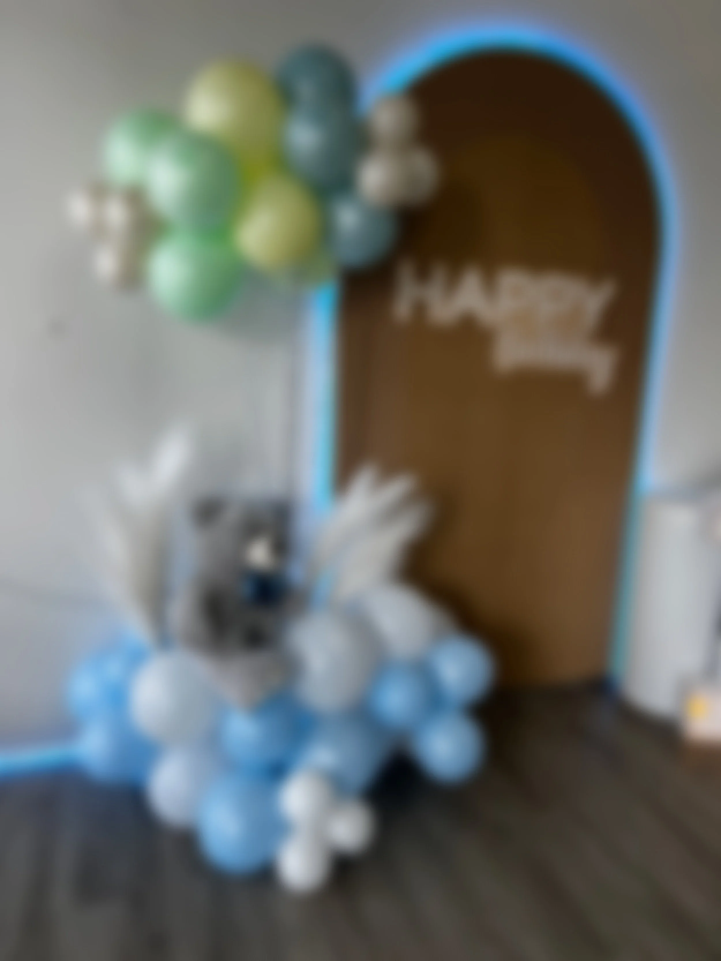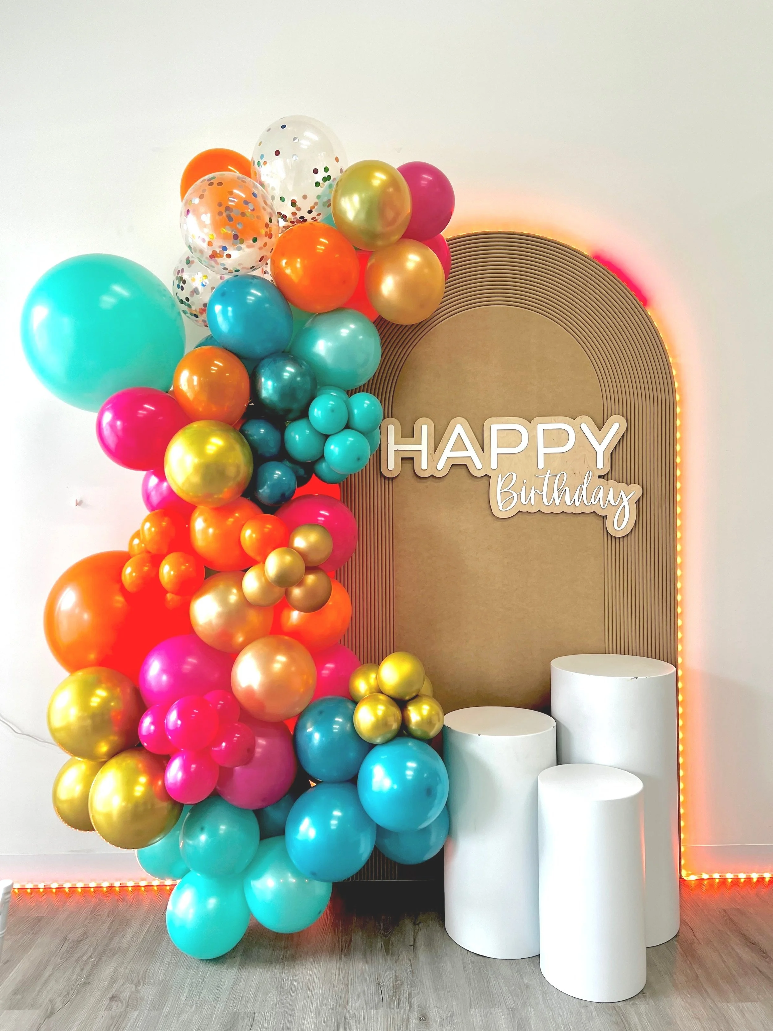 A lighted arched birthday backdrop with Birthday Sign